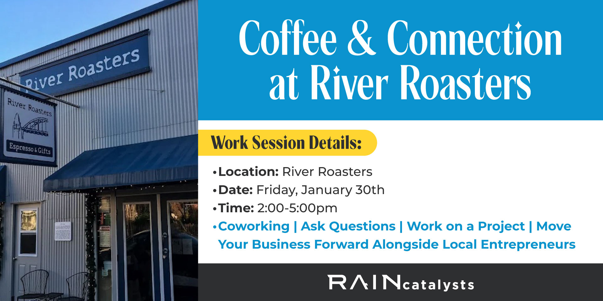 With our Florence Entrepreneur-in-Community, Jade Rehder, out of town for a little while, Brian Brown will be holding an in-person meetup for Coffee & Coworking at River Roasters. This is where local entrepreneurs have the opportunity to have some in-person face time, to come ask questions, get help on a work project, or move their businesses forward. Think of this time as additional “office hours” you can drop in on to ask some questions, or go over your “homework” for what you are working on for your business.