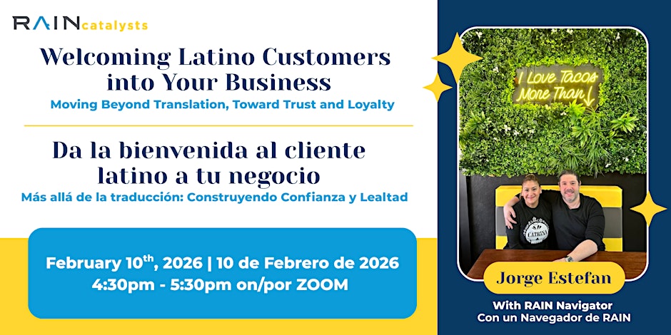 Esta presentación virtual GRATUITA de 1 hora está diseñada para propietarios de negocios que desean mejorar su rentabilidad construyendo relaciones basadas en la confianza con consumidores latinos. Aprenderás qué valoran estos clientes, cómo influye la confianza en sus decisiones de compra y cómo evitar errores culturales que pueden costarle ventas a tu negocio.