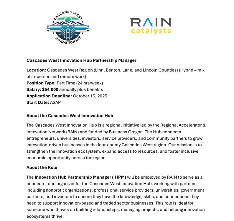 The Innovation Hub Partnership Manager (IHPM) will be employed by RAIN to serve as a connector and organizer for the Cascades West Innovation Hub, working with partners including nonprofit organizations, professional service providers, universities, government partners, and investors to ensure they have the knowledge, skills, and connections they need to support innovation-based and traded sector businesses. This role is ideal for someone who thrives on building relationships, managing projects, and helping innovation ecosystems thrive.